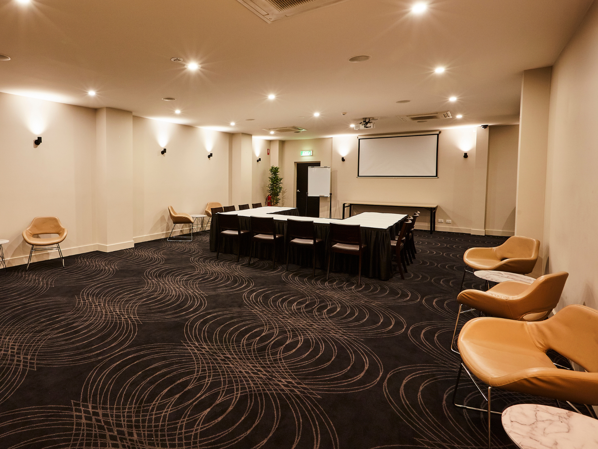 Your event also includes a range of in-house amenities such as white tablecloths, black table skirts, bar staff, security, and access to the venue’s sound system and projector for presentations or slideshows.